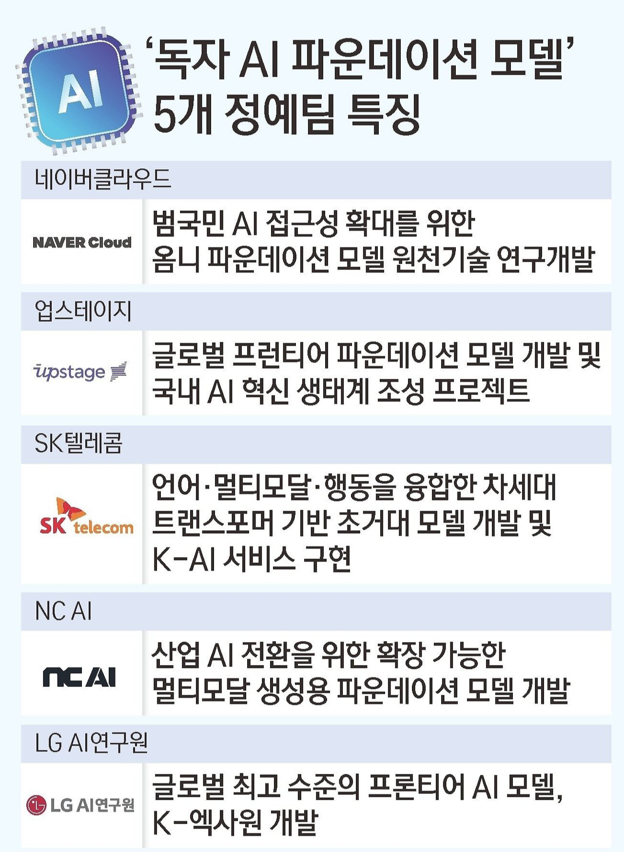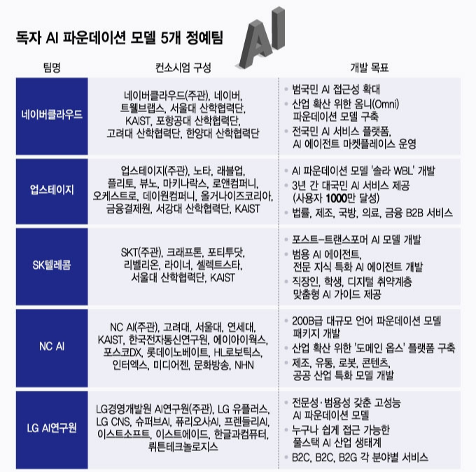 '독자 AI 파운데이션 모델'…네이버·LG·SKT·NC·업스테이지 선정 GPU부터 데이터, 인재까지…2027년까지 총 5000억원 규모 지원 글로벌 수준의 독자 인공지능(AI) 모델을 확보하기 위한 국가대표 AI 기