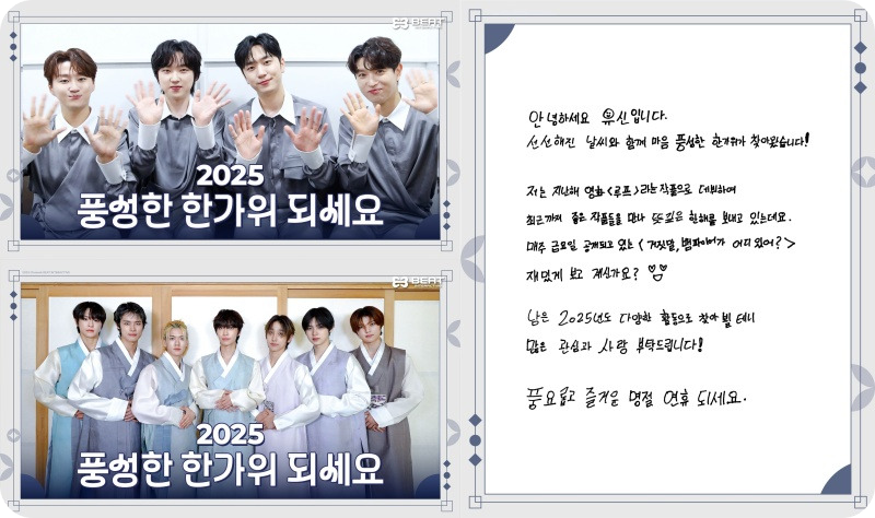 비트인터렉티브 소속 아티스트들이 추석을 맞아 팬들에게 따뜻한 인사를 건넸습니다. 지난 10월 5일과 6일, 공식 SNS를 통해 공개된 포레스텔라, 뉴비트, 배우 유신의 명절 인사 영상과 손편지가 팬들에게 힐링을 선물했습니다.