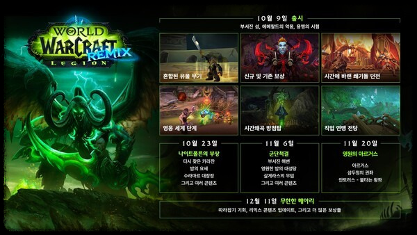 블리자드 엔터테인먼트가 자사의 대표 MMORPG **월드 오브 워크래프트(World of Warcraft)**에 새로운 시즌 이벤트 **‘군단 리믹스(Legion Remix)’**를 10일부터 정식 적용했습니다. 이번 시즌은 ‘기간 한정 이벤트’로, 기존 확장팩 *군단(Legion)*의 콘텐츠를 새롭게 리믹스한 버전입니다.