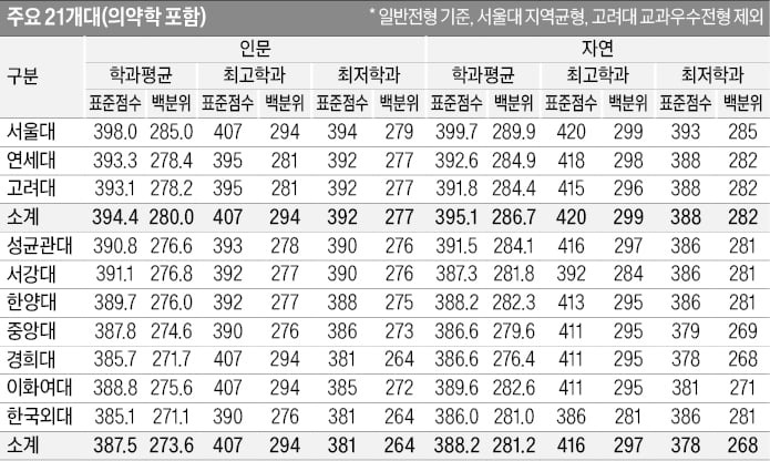 각 대학별 수능 백분위