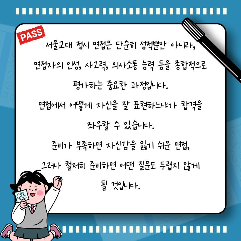 서울교대 면접은 복잡하고 어렵지만, 여러분의 교육적인 가치관을 잘 표현할 수 있는 기회입니다. 준비를 잘 해놓는다면 좋은 결과를 얻을 수 있을 거예요! 무엇보다 신뢰감과 진정성을 잃지 않는 것이 핵심이에요.